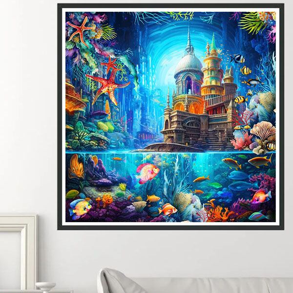 熱帯魚やカラフルな珊瑚のある海底に沈んだ幻想的なお城のデザインです。