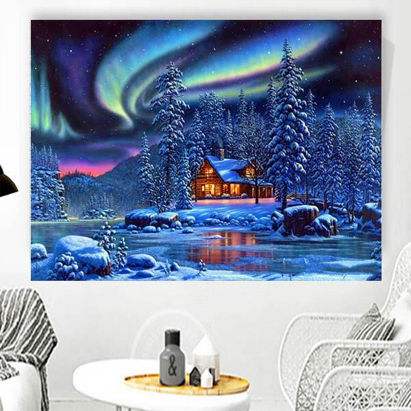 準上級 フル ダイヤモンドアート キット ビーズ刺繍 オーロラ 北欧 針葉樹林 ログハウス モザイクアート パズルアート リハビリ 趣味 絵画 カラービーズ