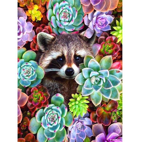 色とりどりな多肉植物の間に隠れているかわいいアライグマのデザインです。