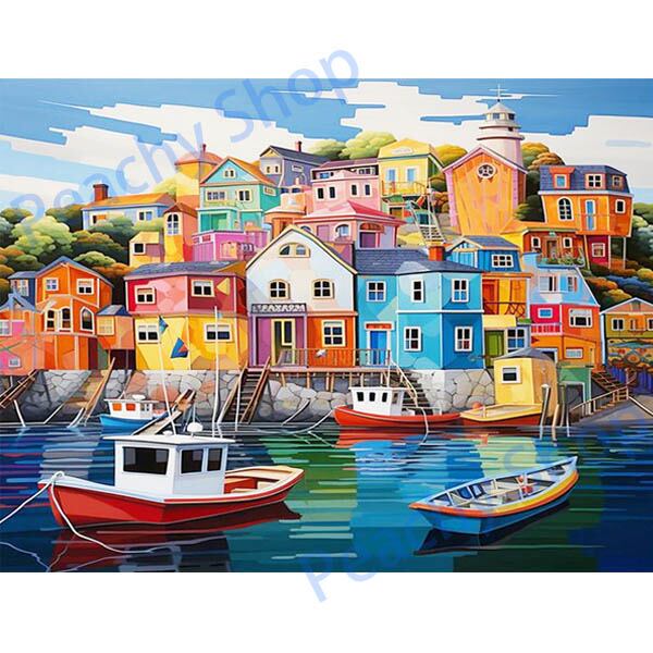 中級 フル ダイヤモンドアート キット ビーズ刺繍 カラフル 建物 漁村 ヨーロピアンモザイクアート リハビリ 趣味 絵画 カラービーズ