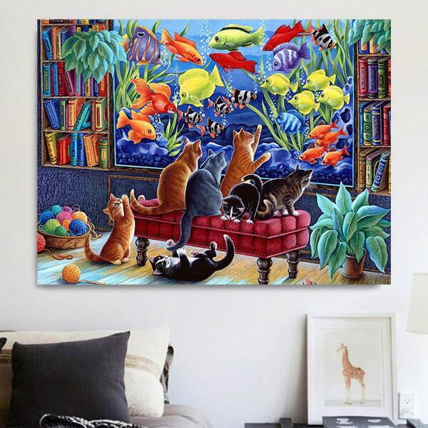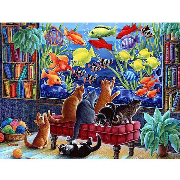 準上級 フル ダイヤモンドアート キット ビーズ刺繍 ネコと熱帯魚 カラフル 魚 猫 モザイクアート パズルアート リハビリ 趣味 絵画