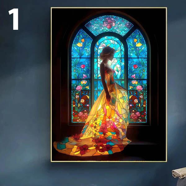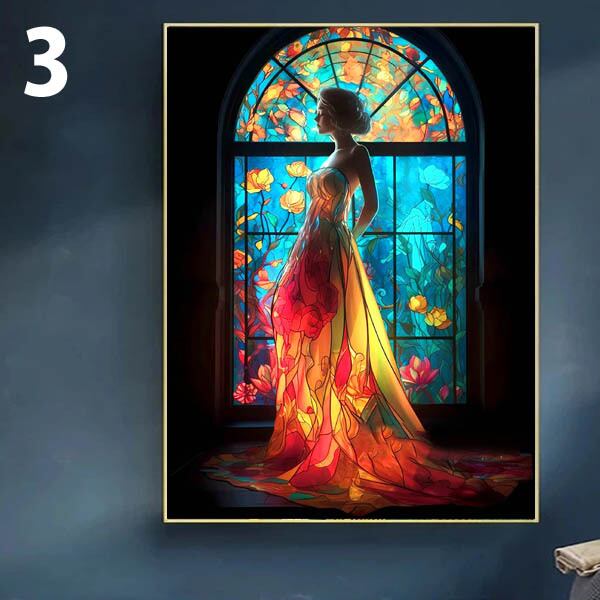 ステンドグラス窓の前に立つドレスを着た美しい女性のデザインです。