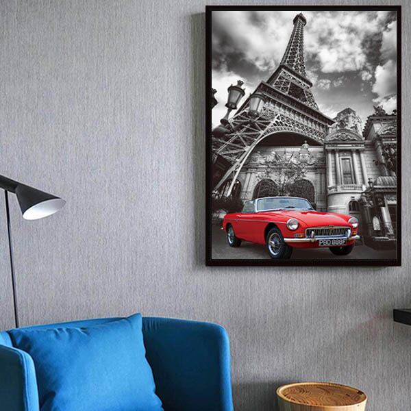 セピア色のエッフェル塔や大都会の街に色鮮やかな車がスタイリッシュ。