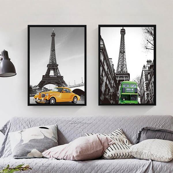 3枚セット 33×43cm アートパネル 枠付きフレーム絵画 エッフェル塔 摩天楼 セピアカラー モノクロ 車 壁掛け アートポスター インテリア絵画