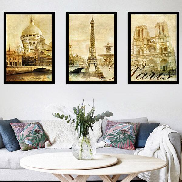 3枚セット 33×43cm アートパネル 枠付きフレーム絵画 ビンテージ レトロ パリ 写生 デッサン 壁掛け アートポスター インテリア絵画